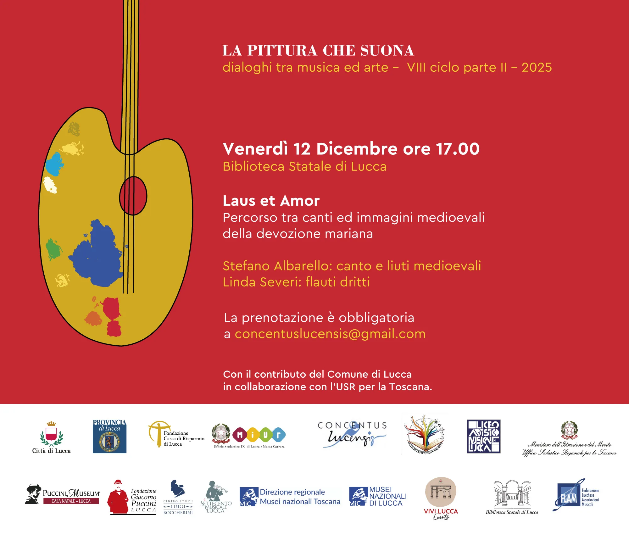 Venerdì 12 dicembre alle ore 17.00 presso i Saloni Monumentali della Biblioteca Statale di Lucca, si terrà il concerto natalizio Laus et Amor a cura di Linda Severi (flauti dritti) e Stefano Albarello (canto, citola e liuto).